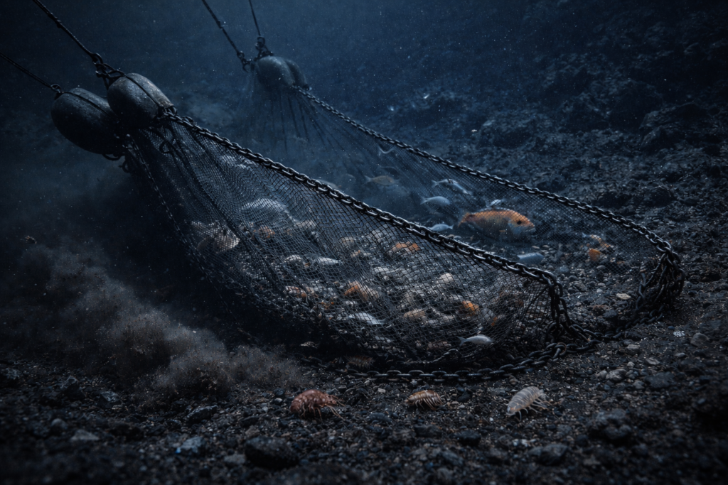 Această metodă implică tragerea unor plase mari peste fundul oceanului pentru a captura pești și alte organisme marine. În timpul acestui proces, plasele pot prinde numeroase specii care nu sunt ținta pescuitului.